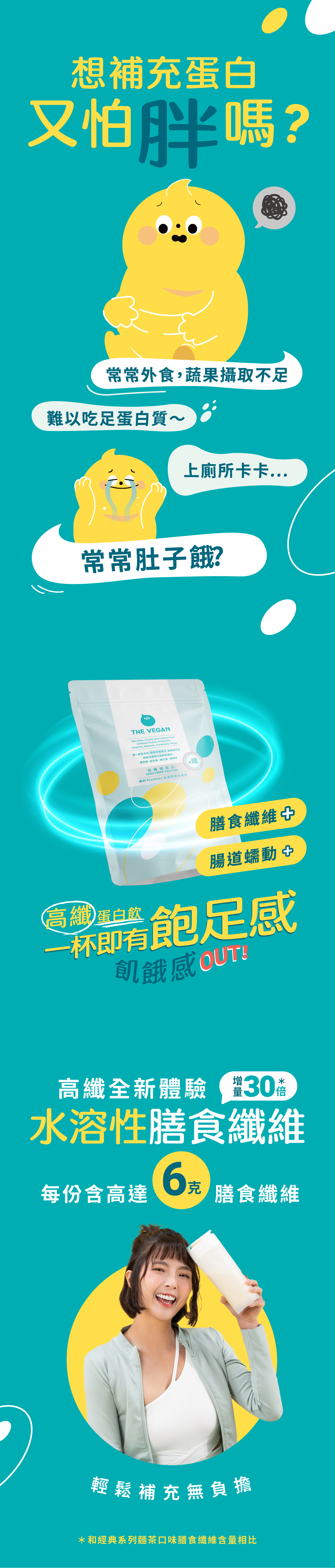 一杯就能補進6g膳食纖維+優質植物蛋白,讓你更飽足、更順暢。
